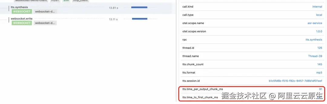 1\] RFC 6455 [datatracker.ietf.org/doc/html/rf...](https://link.juejin.cn?target=https%3A%2F%2Fdatatracker.ietf.org%2Fdoc%2Fhtml%2Frfc6455 "https://datatracker.ietf.org/doc/html/rfc6455") \[2\] The Road to WebSockets [websocket.org/guides/road...](https://link.juejin.cn?target=https%3A%2F%2Fwebsocket.org%2Fguides%2Froad-to-websockets%2F "https://websocket.org/guides/road-to-websockets/") \[3\] WebSocket Protocol [websocket.org/guides/webs...](https://link.juejin.cn?target=https%3A%2F%2Fwebsocket.org%2Fguides%2Fwebsocket-protocol%2F "https://websocket.org/guides/websocket-protocol/") \[4\] OpenAI Realtime API [platform.openai.com/docs/guides...](https://link.juejin.cn?target=https%3A%2F%2Fplatform.openai.com%2Fdocs%2Fguides%2Frealtime-websocket "https://platform.openai.com/docs/guides/realtime-websocket") \[5\] 实时多模态交互协议(WebSocket) [help.aliyun.com/zh/model-st...](https://link.juejin.cn?target=https%3A%2F%2Fhelp.aliyun.com%2Fzh%2Fmodel-studio%2Fmultimodal-interaction-protocol "https://help.aliyun.com/zh/model-studio/multimodal-interaction-protocol") \[6\] Live API - WebSockets API reference [ai.google.dev/api/live](https://link.juejin.cn?target=https%3A%2F%2Fai.google.dev%2Fapi%2Flive "https://ai.google.dev/api/live") \[7\] Trace Context [www.w3.org/TR/trace-co...](https://link.juejin.cn?target=https%3A%2F%2Fwww.w3.org%2FTR%2Ftrace-context%2F%23abstract "https://www.w3.org/TR/trace-context/#abstract") \[8\] Distributed Tracing 基本介绍 [observability.cn/project/ope...](https://link.juejin.cn?target=https%3A%2F%2Fobservability.cn%2Fproject%2Fopentelemetry%2Frp8k7gzvtys07zsb%2F "https://observability.cn/project/opentelemetry/rp8k7gzvtys07zsb/") \[9\] 通过OpenTelemetry Java SDK为调用链增加自定义埋点 [help.aliyun.com/zh/arms/app...](https://link.juejin.cn?target=https%3A%2F%2Fhelp.aliyun.com%2Fzh%2Farms%2Fapplication-monitoring%2Fuse-cases%2Fuse-opentelemetry-sdk-for-java-to-manually-instrument-applications%3Fspm%3Da2c4g.11186623.help-menu-search-34364.d_5 "https://help.aliyun.com/zh/arms/application-monitoring/use-cases/use-opentelemetry-sdk-for-java-to-manually-instrument-applications?spm=a2c4g.11186623.help-menu-search-34364.d_5") \[10\] OpenTelemetry Specification Overview [opentelemetry.io/docs/specs/...](https://link.juejin.cn?target=https%3A%2F%2Fopentelemetry.io%2Fdocs%2Fspecs%2Fotel%2Foverview%2F "https://opentelemetry.io/docs/specs/otel/overview/") \[11\] 手动安装探针 [help.aliyun.com/zh/arms/app...](https://link.juejin.cn?target=https%3A%2F%2Fhelp.aliyun.com%2Fzh%2Farms%2Fapplication-monitoring%2Fuser-guide%2Fmanually-install-arms-agent-for-java-applications "https://help.aliyun.com/zh/arms/application-monitoring/user-guide/manually-install-arms-agent-for-java-applications") \[12\] 《[让每次语音唤醒都可靠,公牛沐光重构可观测体系](https://link.juejin.cn?target=https%3A%2F%2Fmp.weixin.qq.com%2Fs%3F__biz%3DMzUzNzYxNjAzMg%3D%3D%26mid%3D2247577965%26idx%3D2%26sn%3D842338decd2e1d6886f9f7c77b0e68fc%26scene%3D21%23wechat_redirect "https://mp.weixin.qq.com/s?__biz=MzUzNzYxNjAzMg==&mid=2247577965&idx=2&sn=842338decd2e1d6886f9f7c77b0e68fc&scene=21#wechat_redirect")》