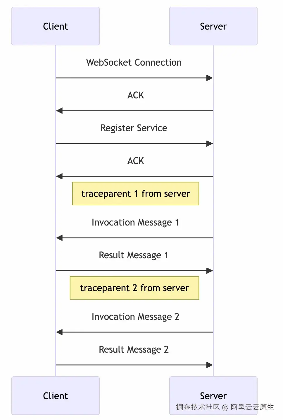 虽然我们根据 WebSocket 连接的发起方与接收方将两端分为了 Client 和 Server,但实际业务的处理过程是高度灵活的双向流,可能存在由 Server 侧发起请求,Client 进行处理的情况。例如,允许 Client 主动与 Server 建立连接并将自身服务注册给 Server 端,由 Server 发送消息来对 Client 进行回调。对于这种交互方式而言,消息生产方(调用方)是 Server,消费方(被调用方)是 Client,因此链路上下文应该由 Server 注入到消息中,由 Client 还原并进一步传递。