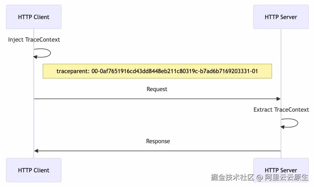对于常规的 HTTP 调用,为了保证链路的连通性,调用方会在 HTTP headers 中额外添加一组用于承载链路上下文的键值对,确保被调用方在解析协议时能够正确地还原调用方的链路上下文,进而保证上下文可以被继续传递下去。图示是使用 W3C 链路追踪协议 [ 7] 时,链路上下文的 header 的一个具体示例: