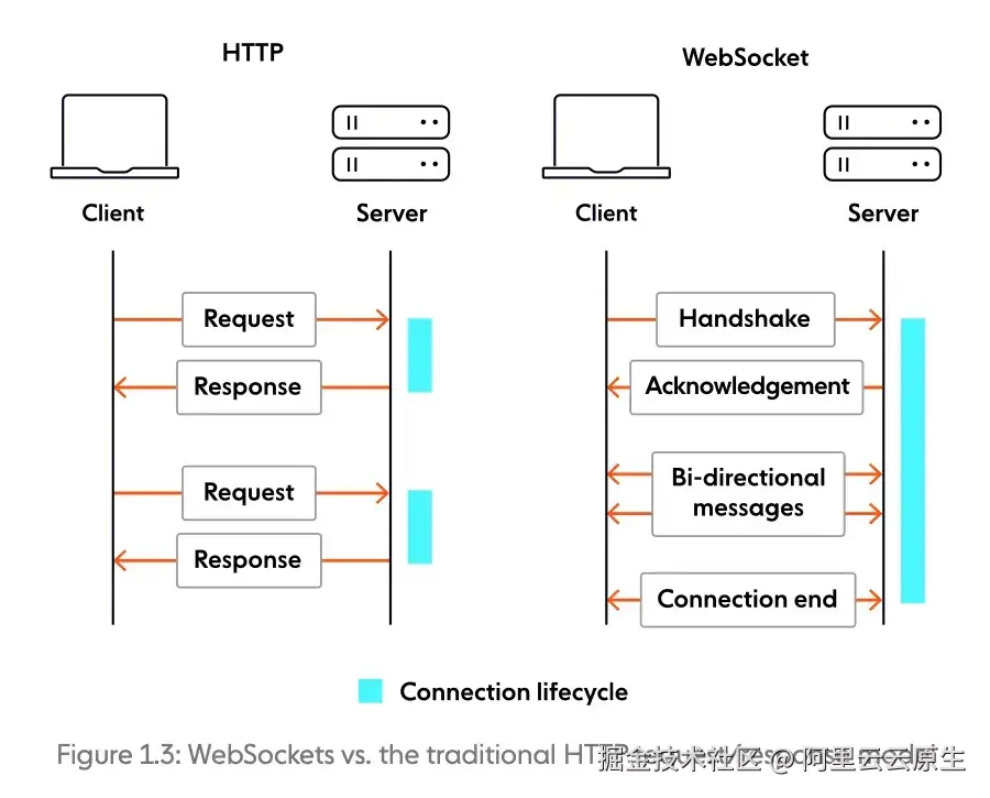 与传统 HTTP 协议对比,WebSocket 在通信模式上实现了根本性突破: