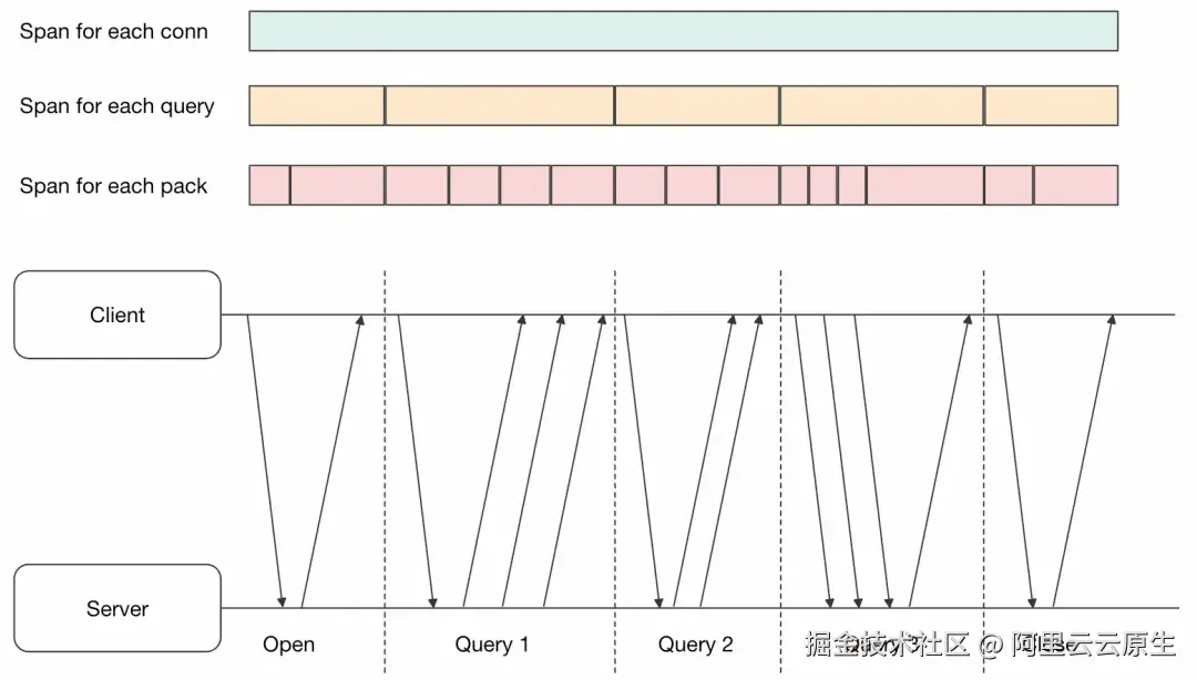- 如果连接建立后,一方发送消息,另一方处理消息并返回响应,则每组这类调用都可以创建一对父子 Span,对应的数据结构需要允许承载序列化后的链路上下文。