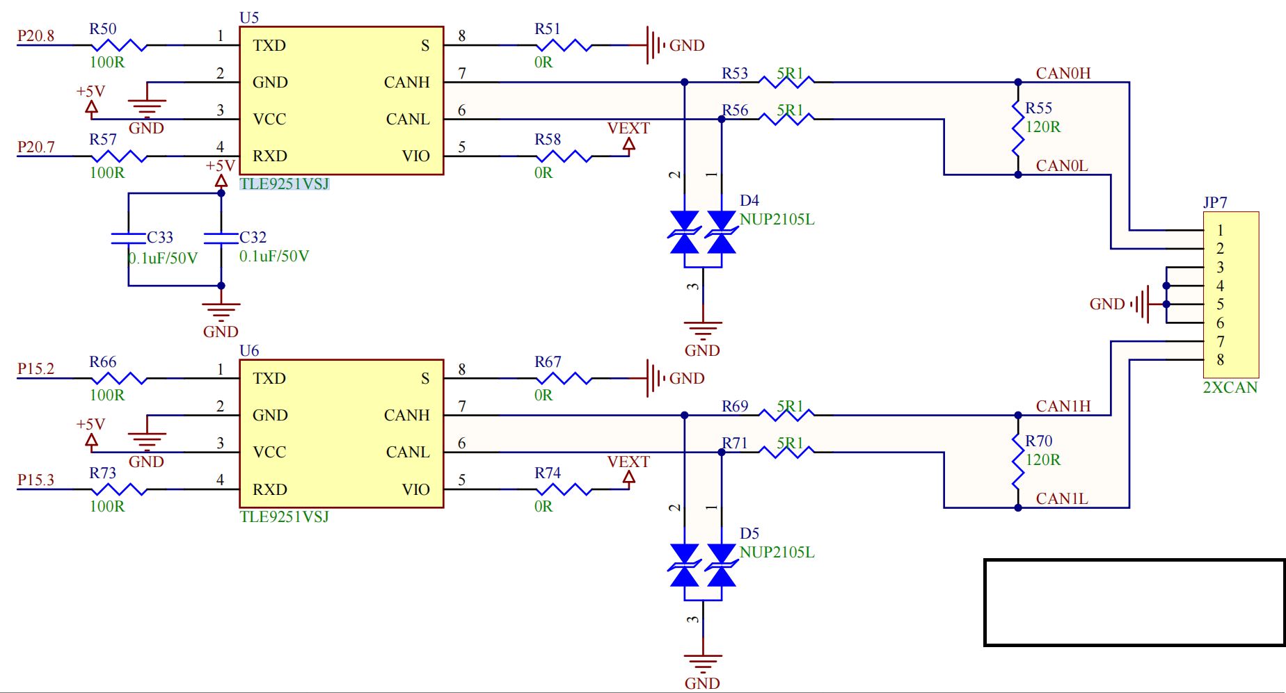 MCU (P20.7/P20.8) → 收发器 → 120Ω终端电阻 → JP7接口