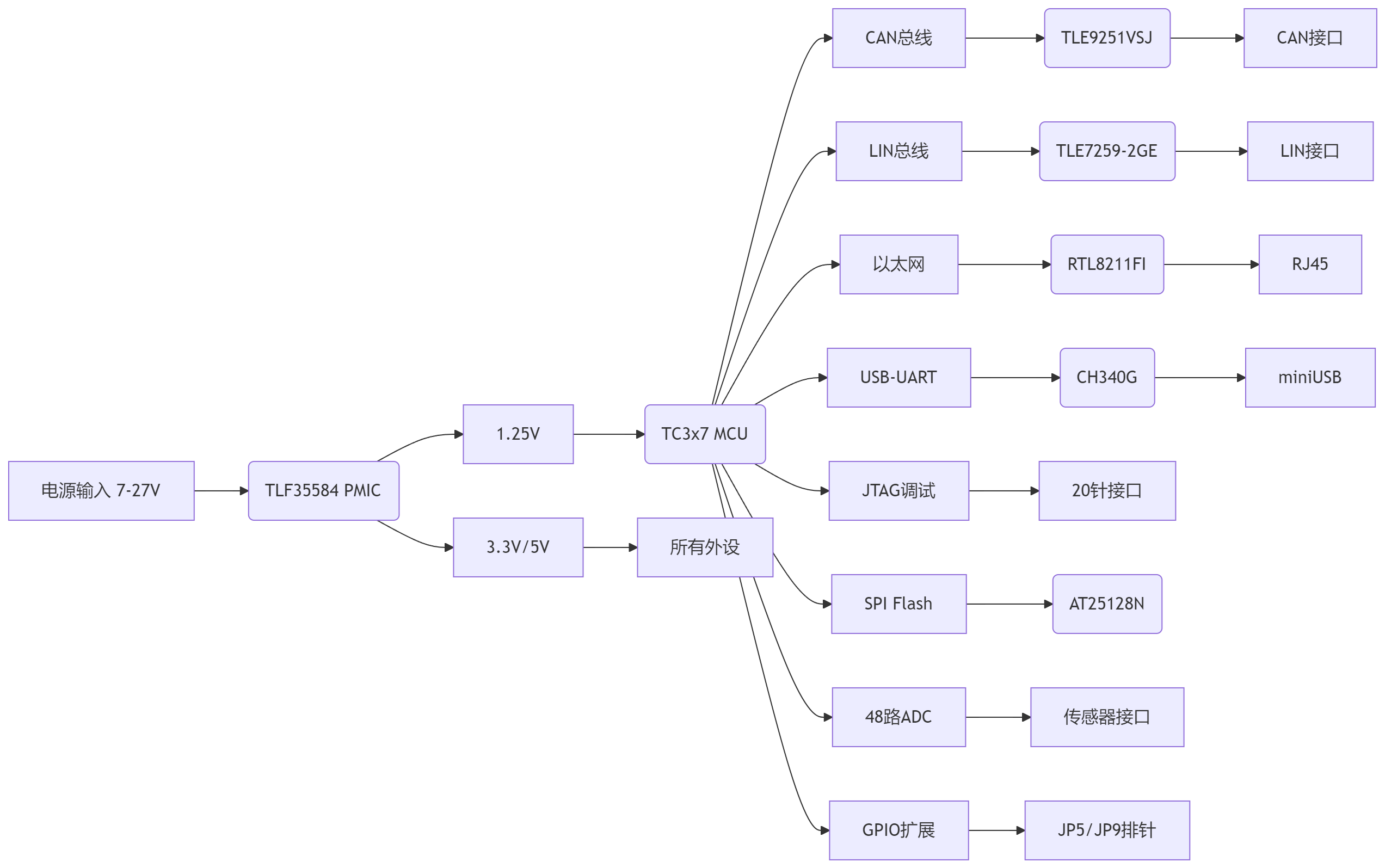 TLF35584转换 → 生成 1.25V内核电压 + 3.3V/5V外设电压 -