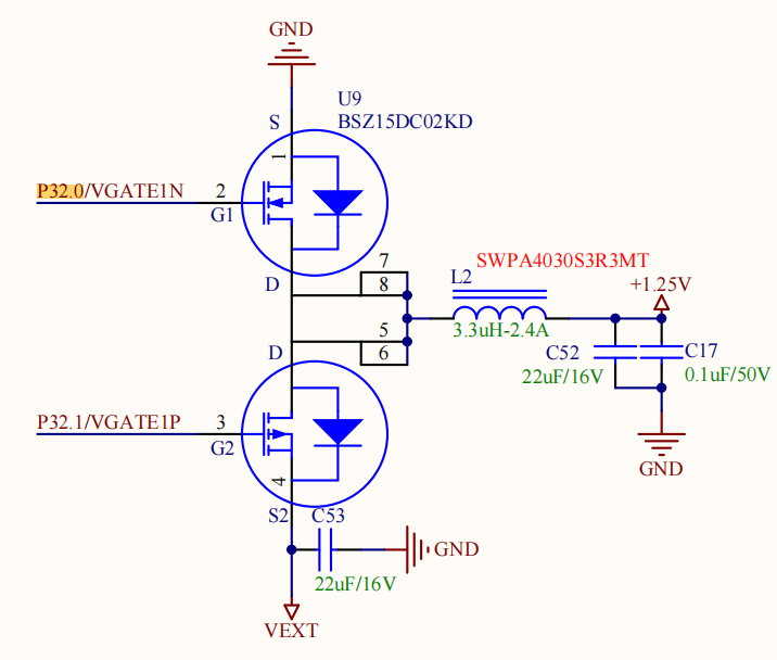 P32.0/P32.1:连接MOSFET驱动(BSZ15DC02KD)