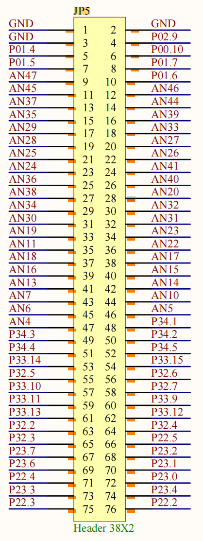 - JP5(38×2):引出所有GPIO/ADC