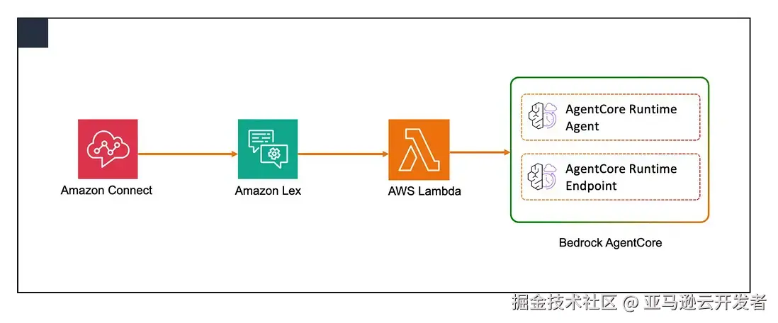 在本次实践中,我们多Agent的应用部署平台,就采用了AgentCore Runtime。它保证了我们客服能够按需付费,不用为客服的闲时花费基础资源费用,同时Runtime的高扩展性,也保证了整个系统可以应对突然的业务高峰冲击。 我们客服机器人的业务调用流如下: Connect 服务为客服机器人系统的接入模块,负责chat或voice数据的流入,Lex为客服逻辑模块,负责意图识别和系统调度,Lex可以通过Lambda调用部署在AgentCore Runtime上的多Agent客服系统,自动处理客户问题。