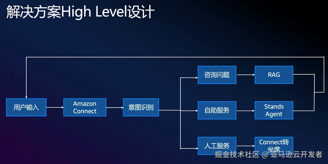 本次实践采用Amazon Connect的Chat文字聊天作为客户接入方式,整个自助服务的流程控制采用Amazon Connect的Workflow设计实现,客户输入后由Connect通过lambda来调用GenAI模型来实现意图识别,基于Bedrock的RAG知识库查询,基于Stands框架的的 Multi Agent来实现自助服务,不同的意图会对应不同的处理流程,详见图1。
