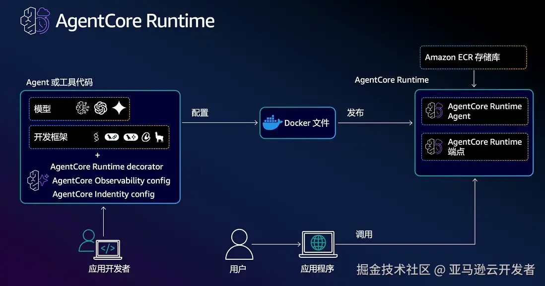 - Amazon Bedrock AgentCore Runtime是为Agent是一个专门为托管 AI Agent而设计的基础设施。它采用容器化的部署方式,负责处理用户输入、维护上下文,并利用容器的隔离能力,给AI应用一个安全高效的运行环境。