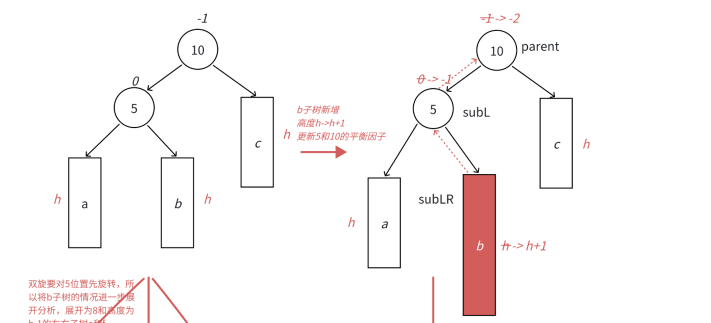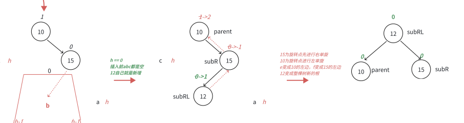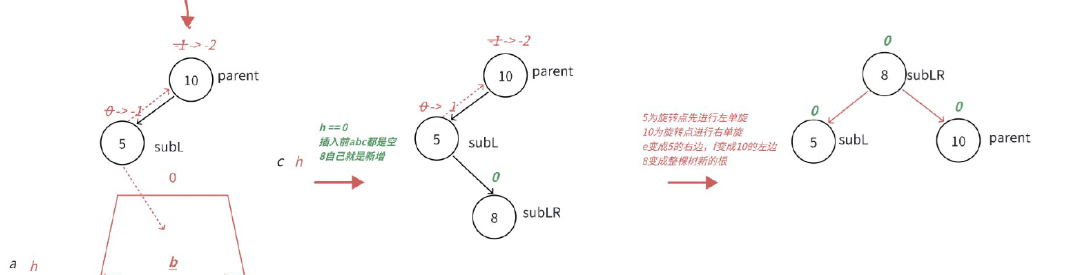 场景三的情况下a/b/c子树都是空树,然后是b自己进行新增一个结点,然后对sudL和parent的平衡因子进行更新,旋转前sudLR的平衡因子为0,旋转后sudL、sudLR、parent的平衡因子均为0。
