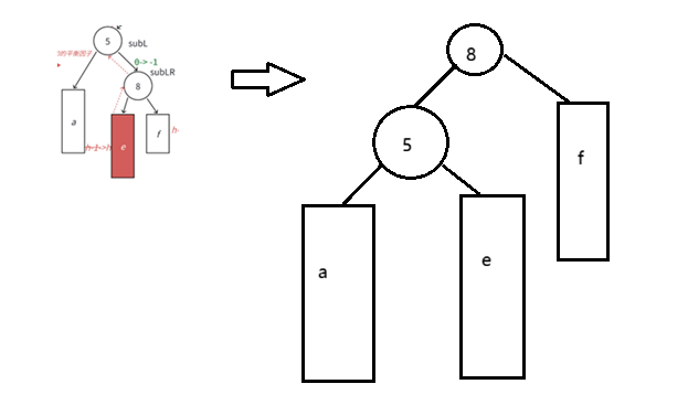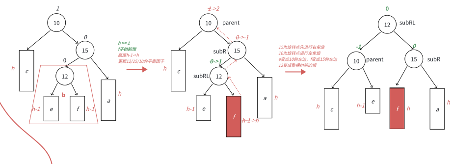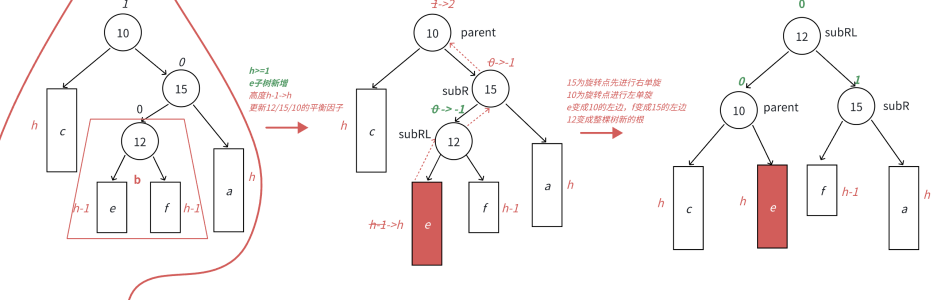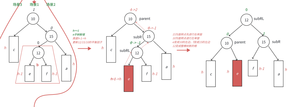 对于场景一,其新增结点是插入在e树的,其插入影响了sudRL、sudR、parent的平衡因子,在旋转前,sudRL的平衡因子为-1,然后旋转后,parent和sudRL的平衡因子都变成了0,sudR的平衡因子为1。