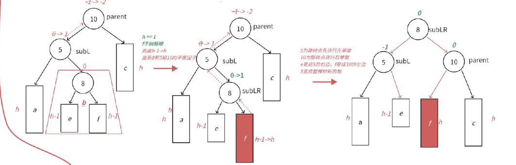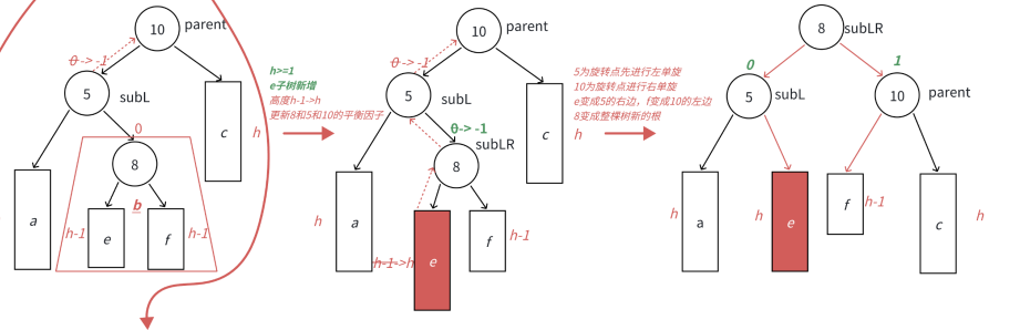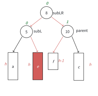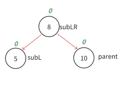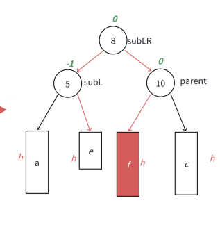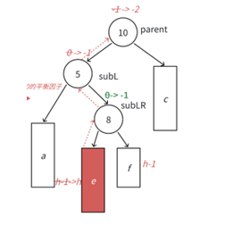 在场景一的情况下,首先新增的结点插入在e这个位置,那么导致其祖先结点8->5->10的平衡因子不断更新,到10这个结点的平衡因子的绝对值超过了1,导致旋转。其中sudLR这个结点的平衡因子在旋转前为-1,然后旋转后sudLR和sudL的平衡因子都为0,parent的平衡因子变为1。