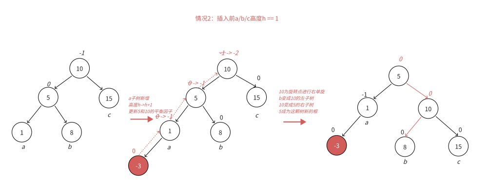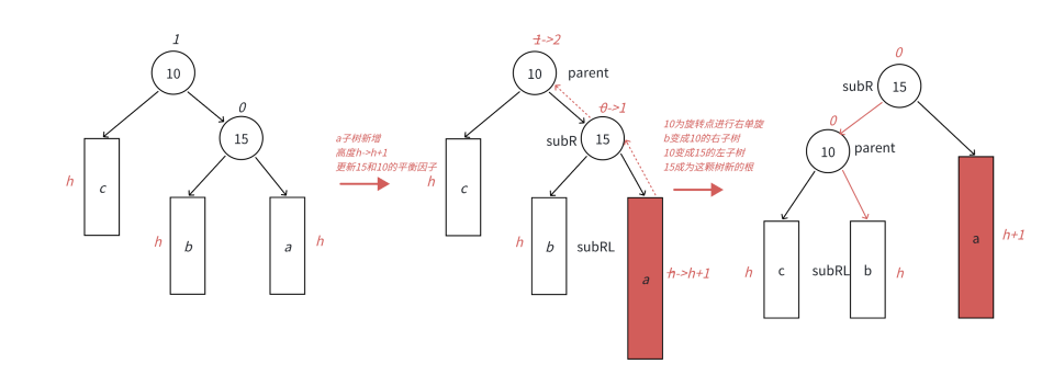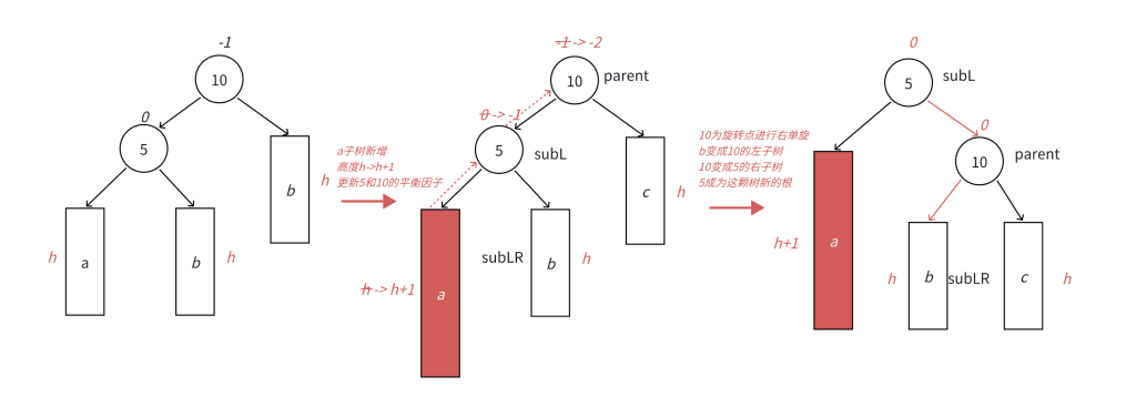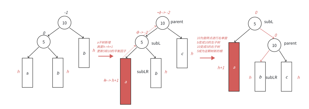 如图所示,我们的a子树,其高度为h,此时a处插入一个结点,导致a子树的高度变为h+1,然后平衡因子更新,导致根结点的平衡因子更新为-2,那么此时就需要进行旋转调整树的结构了。