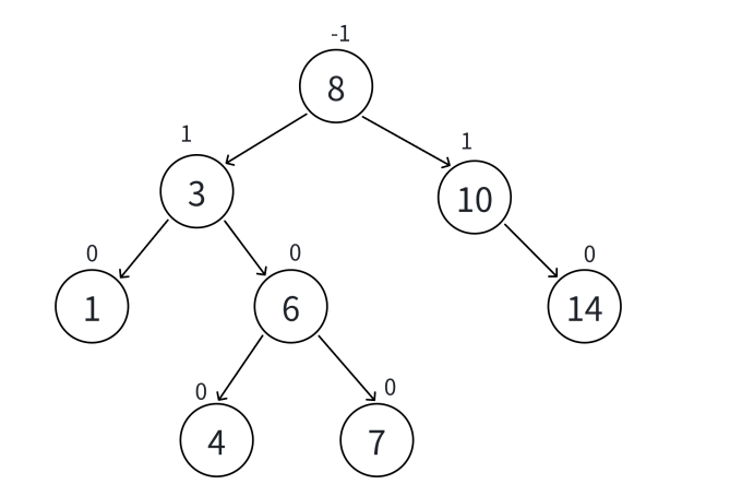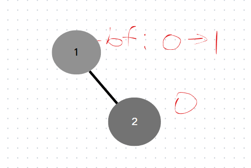 例如这种情况,那么我们的新增结点2其是插在1这个结点是右边的,那么按照我们计算平衡因子的方式,那么我们的1结点的平衡因子就要+1。然后要是我们插入的数据是0,那么其应该插入在1这个结点的左边,那么此时1的平衡因子就-1操作。
