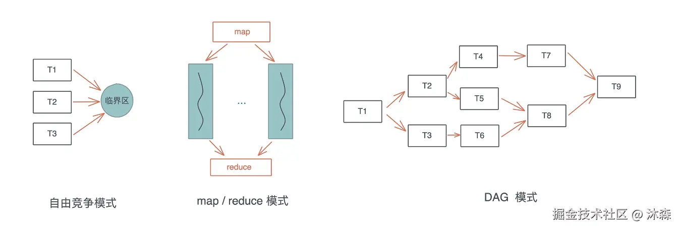 并发状态下几种常见的工作模式:自由竞争模式、map/reduce 模式、DAG 模式: