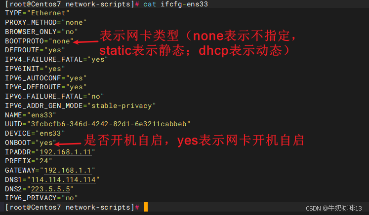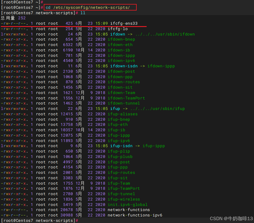 在红帽系的系统中网卡的配置文件是在【/etc/sysconfig/network-scripts/】目录下以【ifcfg】开头的文件中(如ifcfg-ens33)。
