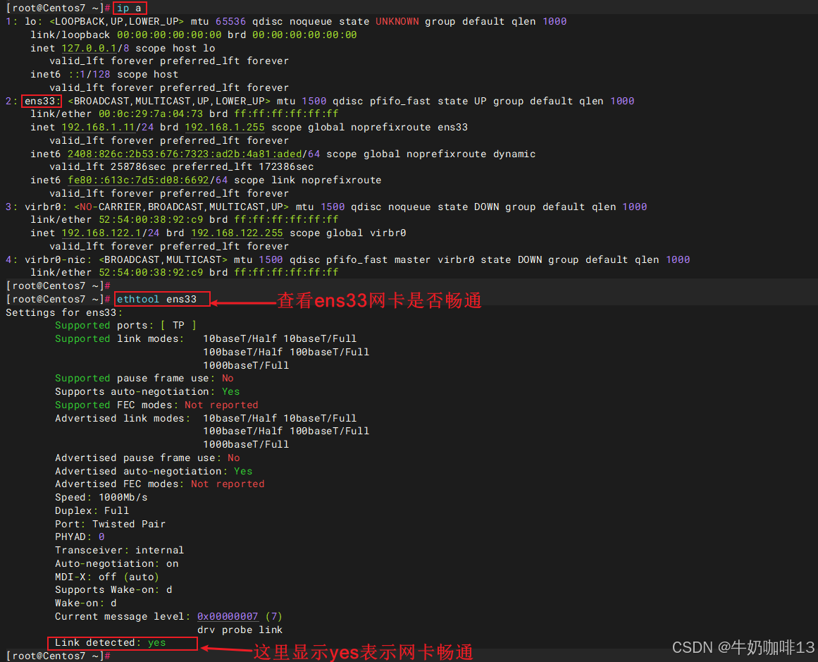 **方法二:**可以通过命令【ethtool 网卡名称】来查看指定网卡的链路是否物理连通(显示结果最后的【Link detected】后面的值显示【yes】表示网卡的物理连通)。