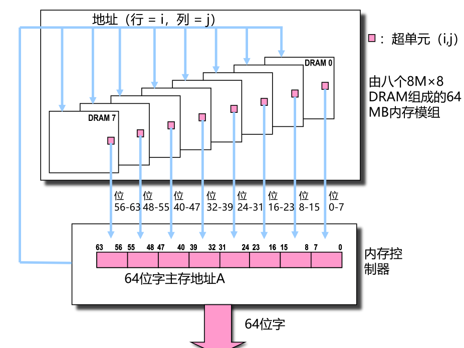 - 64MB内存模块:由八个8Mx8 DRAM芯片组成,每个芯片提供8位数据(bit 0-7 至 bit 56-63),形成64位字宽的主存。