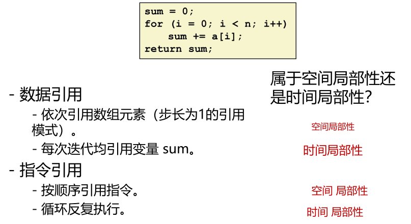 - 空间局部性:地址相近的项倾向于在时间上被临近引用。