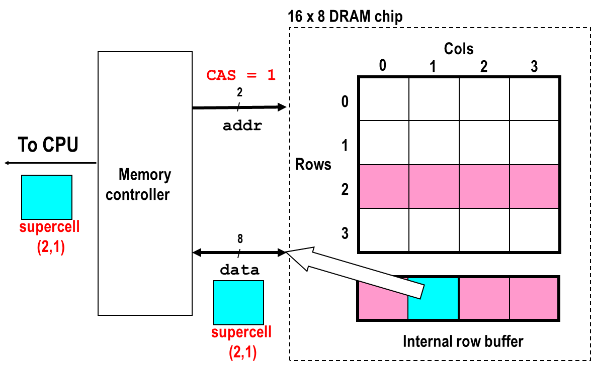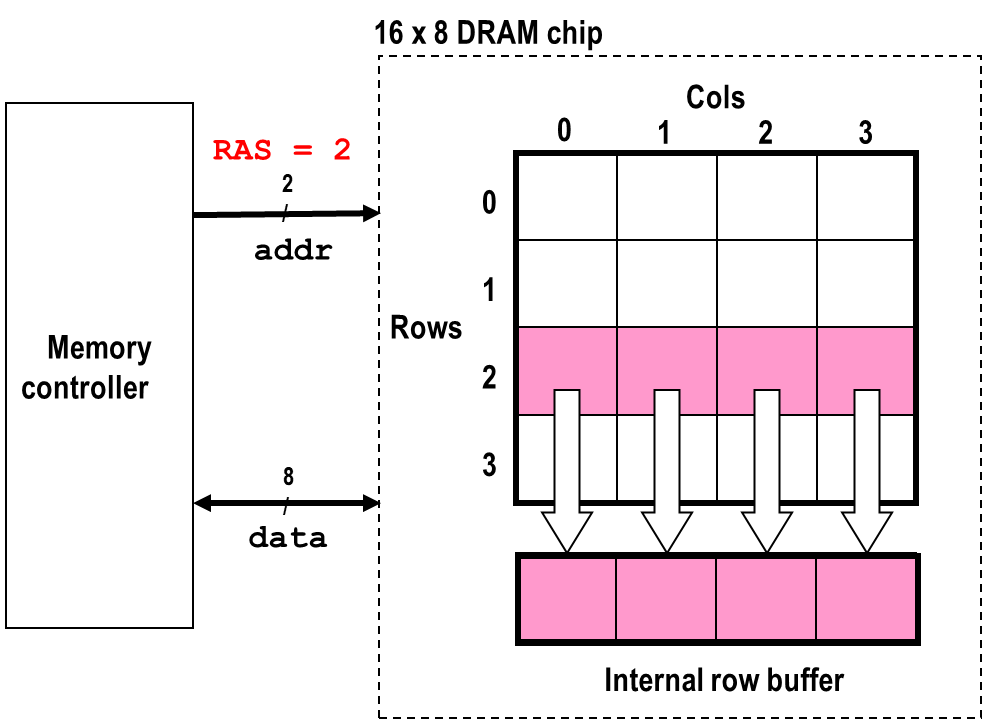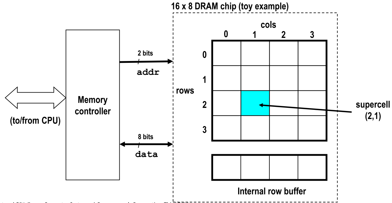 - 16x8 DRAM芯片:地址输入为2位,数据输出为8位,内部包含行缓冲区,连接内存控制器与CPU的数据通路。