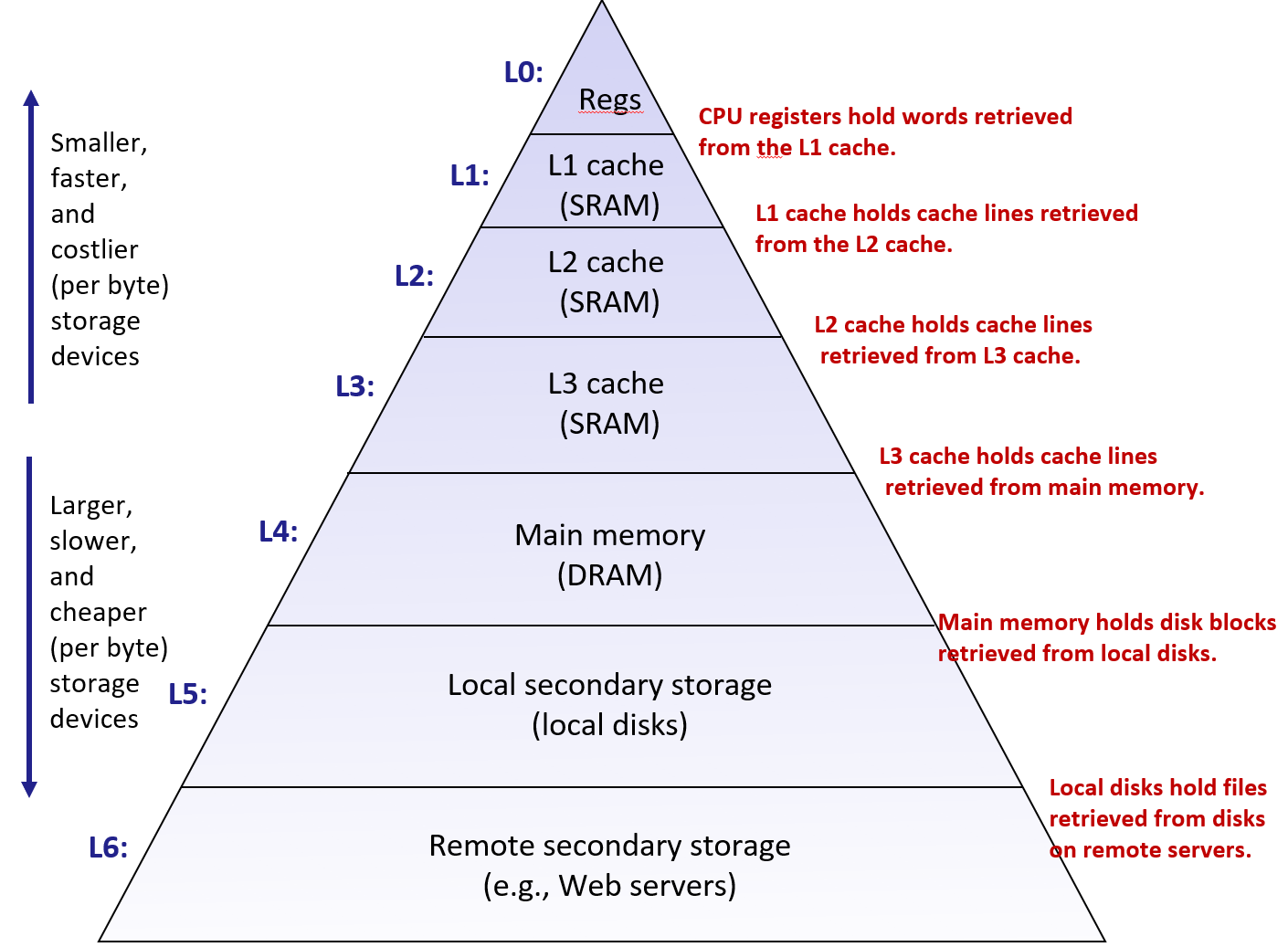 - 数据逐级加载:寄存器 ← L1 ← L2 ← L3 ← 主存 ← 本地磁盘 ← 远程服务器。
