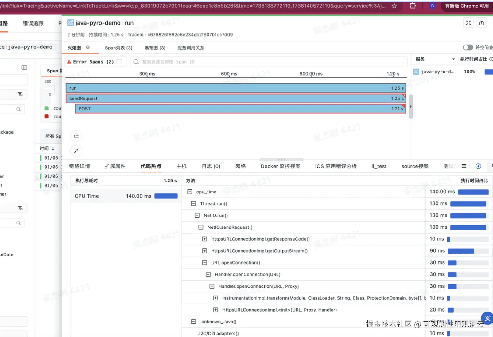 观测云在采集 profiling 数据时可以通过一些配置实现 profiling 与 tracing 数据的关联,其原理主要是通过给 profiling 和 tracing 注入 runtime_id 标签实现关联,在链路中可以点击代码热点,可以看到关联的 profiling 信息。