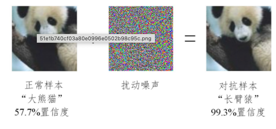 图例:添加噪声后,机器识别率下降,但人脑可以毫不费力的识别出来