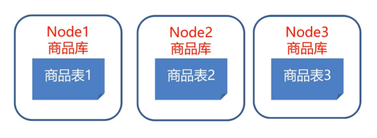 然后有三台服务器,三台服务器上都安装MySQL,都创建商品库,商品库中创建商品表。通过把商品表的三千万条记录拆成三份,每份一千万条记录。把三千万条数据平摊到这三台服务器上进行存储。