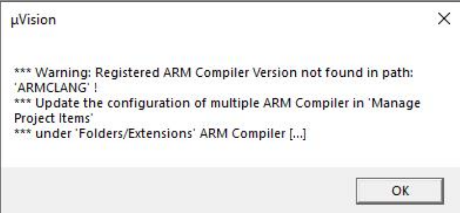 在打开MDK的时候,会跳出提示"Warning: Registered ARM Compiler Version not found in path: ARMCLANG!"(如图1)这样的提示信息。提示无法找到编译器的路径,这样的问题经常出现在添加旧版本编译器过程中操作出错的情况下。