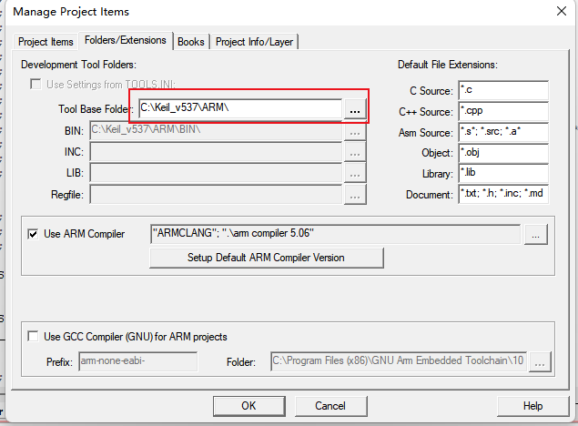 2)、然后,打开Manage Project Items,选择Folders/Extensions,看一下Tool Base Folder中选择的路径是否是ARM文件夹(如图3)。这个的路径必须是软件安装目录下的ARM文件夹,例如:C:\Keil_v538\ARM。