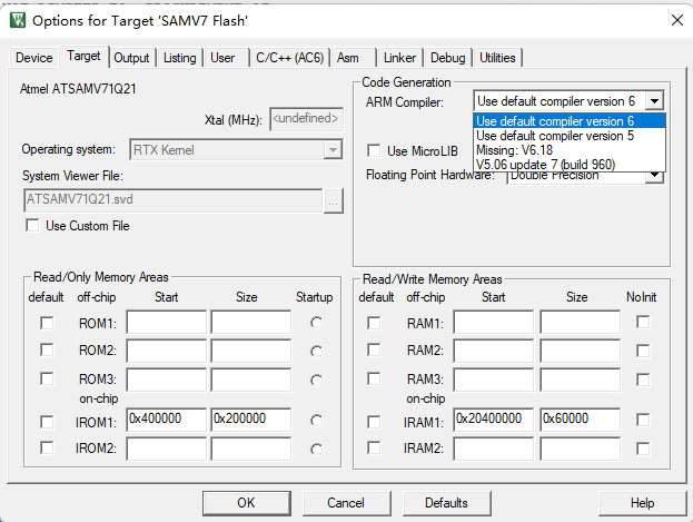 1)、如果打开软件之后跳出了图1 的提示后,可以在option->target中进一步确认是否是编译器路径错了。如果编译器路径错误,则target会和图2一样,只显示一些配置参数。