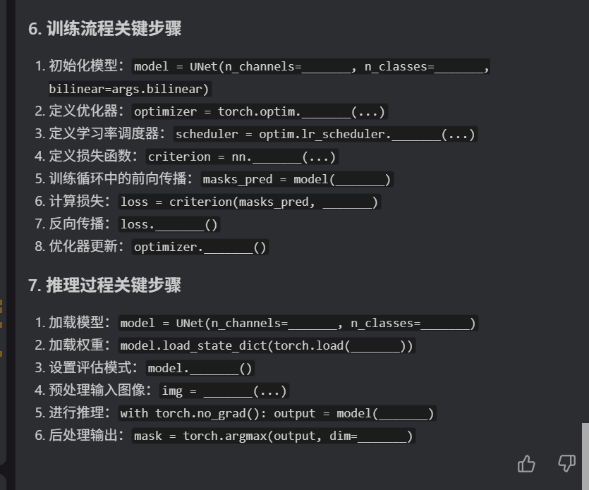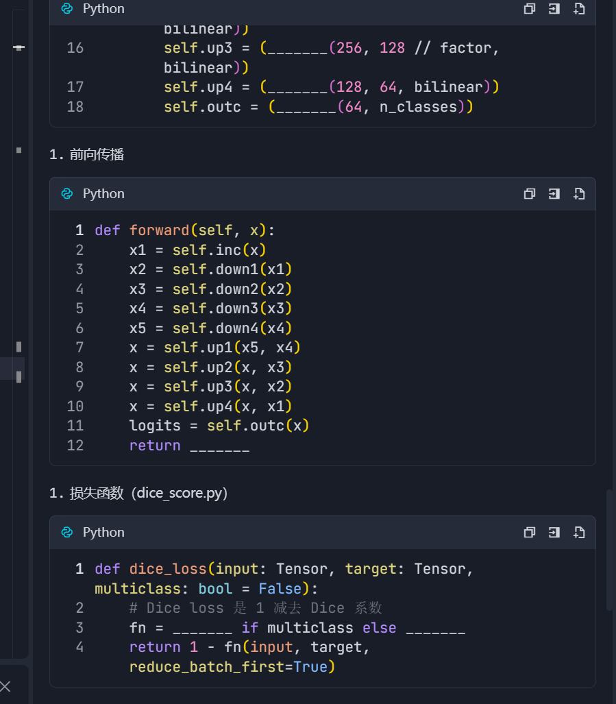 此处的代码生成,主要面对的是个人学习开源项目来设置的prompt(因为我目前还是以跟着项目学习为主,未曾尝试从0开始实现一个完整的项目,这一方面水平欠缺得再等一等),prompt为:我想要学习该项目,请根据该项目的重点内容,以完型填空的形式给出相应的学习模板,我只需要根据提示在学习模板中填空,即可实现完整项目,现在请以该项目中的算法模型为例。