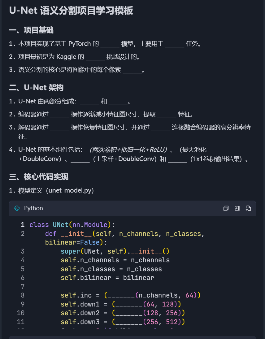 这个模板将帮助您深入理解U-Net的核心原理和实现细节,为后续的深度学习项目打下坚实基础。