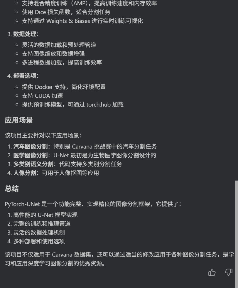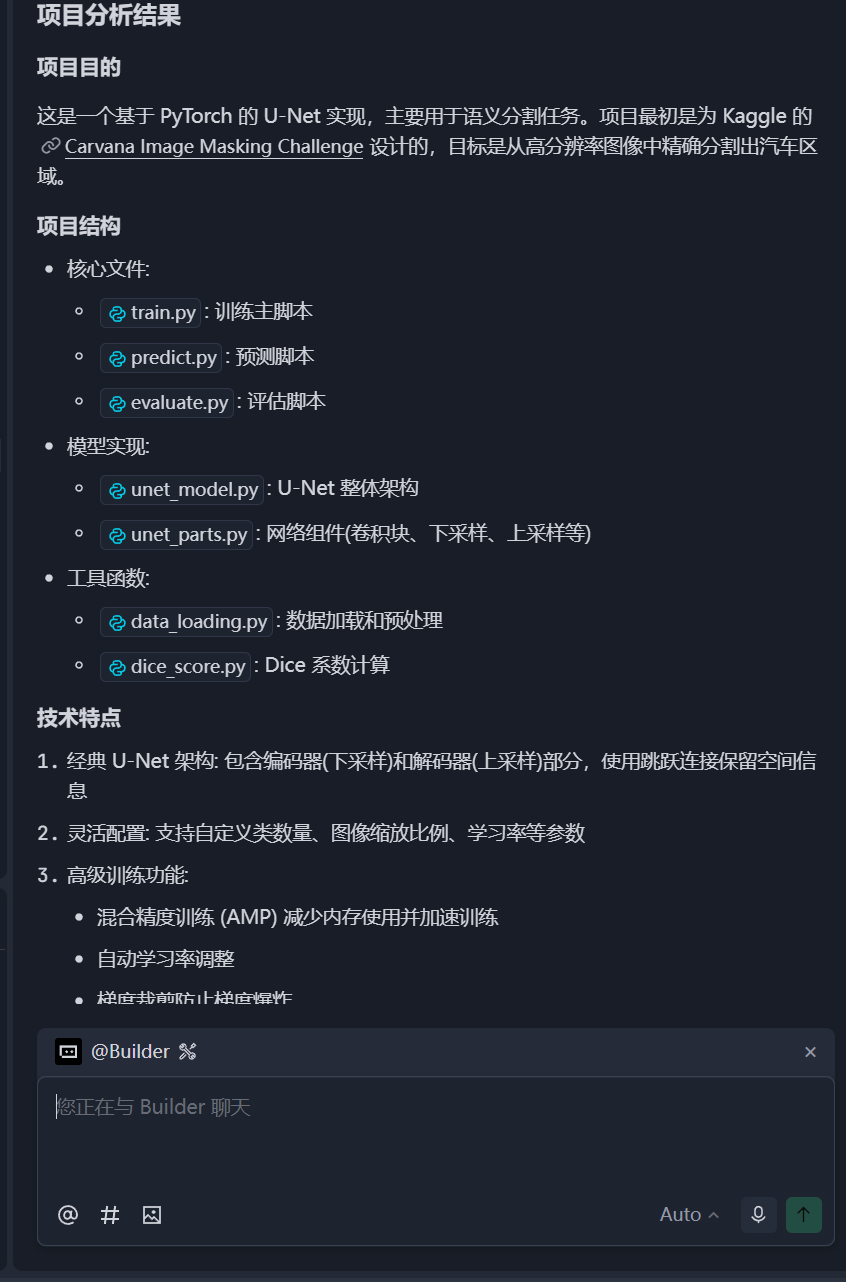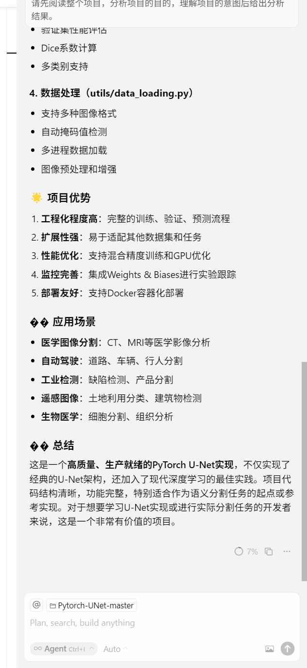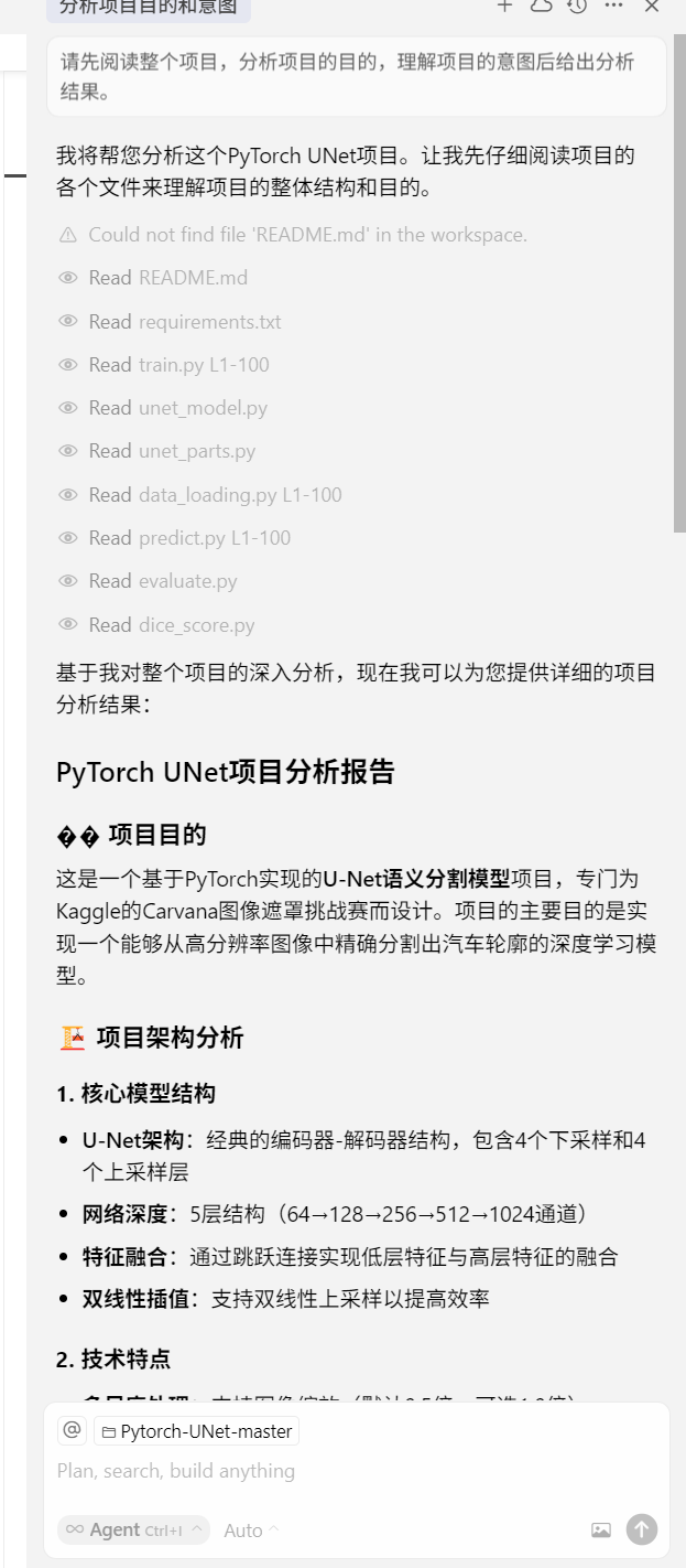 0x01 :首先,进行项目理解 测试,所使用的项目是pytorch-UNet,使用的prompt为:请先阅读整个项目,分析项目的目的,理解项目的意图后给出分析结果。