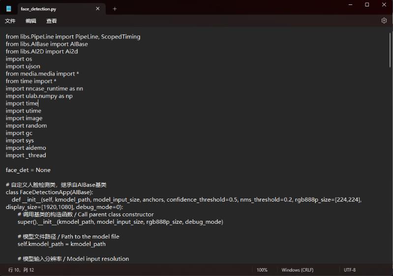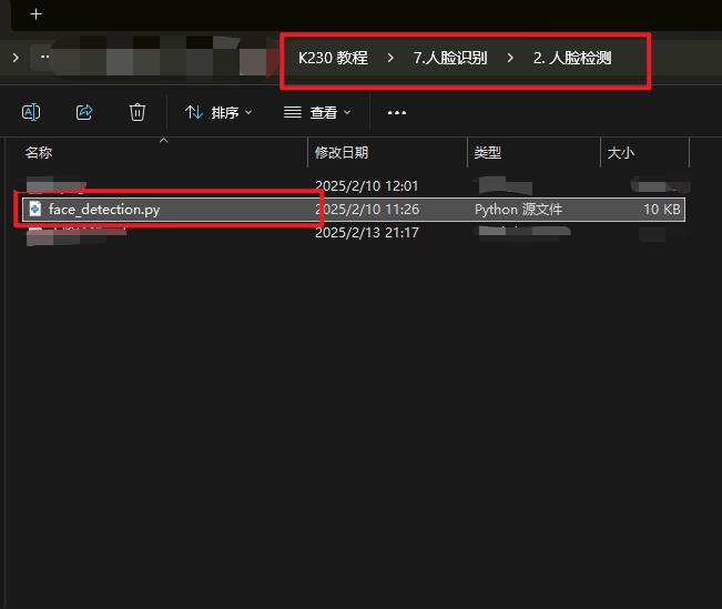 我们以人脸检测为例,打开我们下载的资料中【7.人脸识别 / 2.人脸检测】这个目录,找到face_detection.py