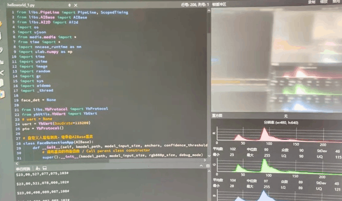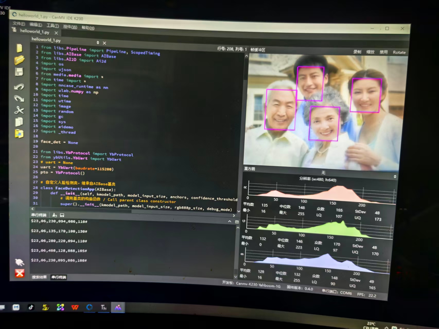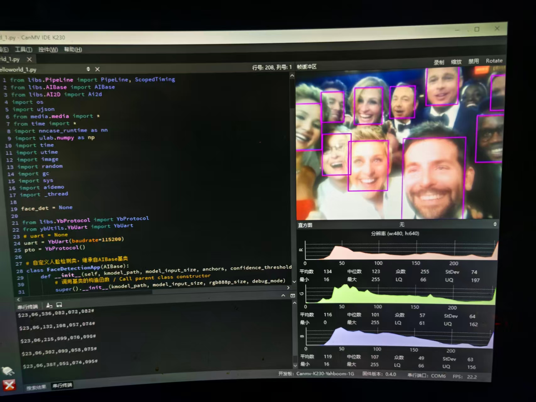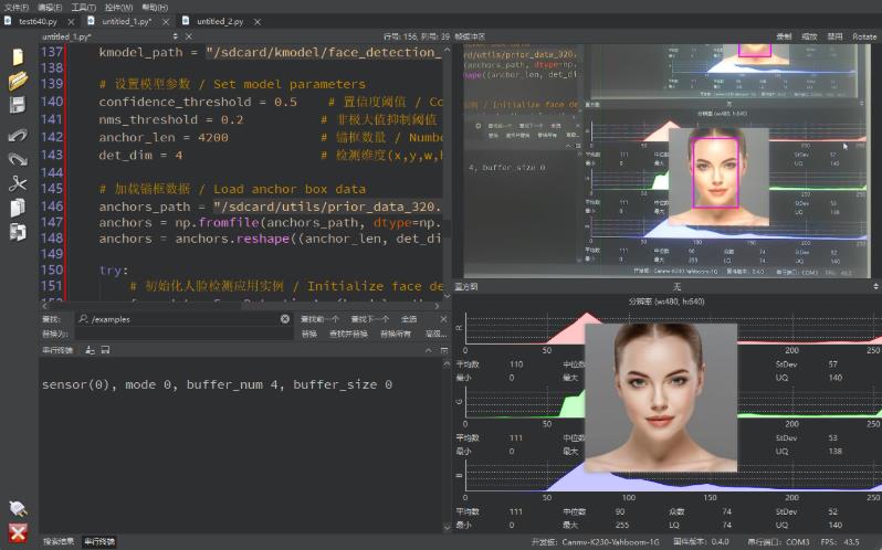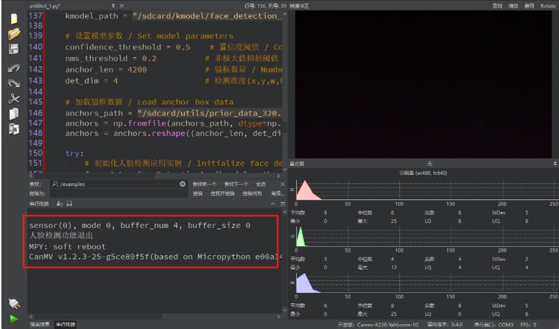 粘贴成功后,点击左下角绿色的运行按钮,K230将执行人脸检测功能