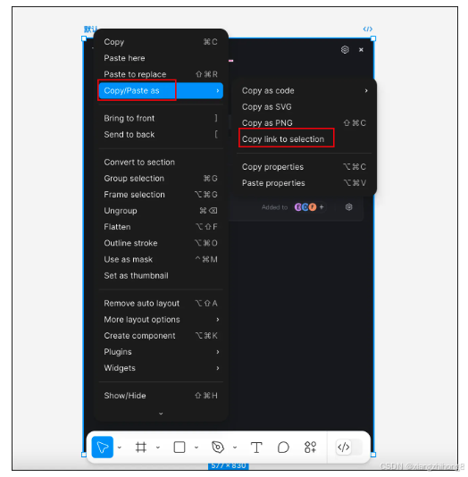 打开 Figma 设计稿页面,选中目标画板,右键 → Copy/Paste as > Copy link to selection,复制链接。