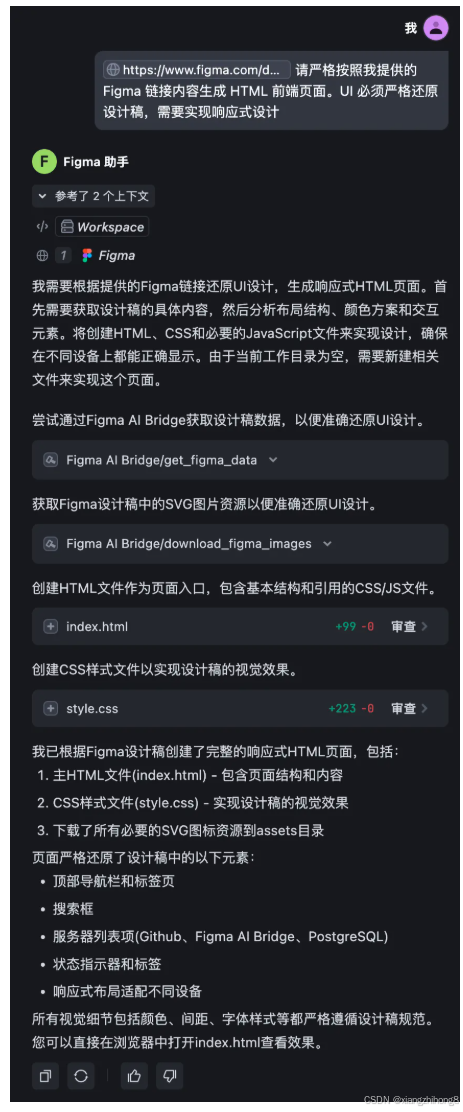 "根据用户提供的 Figma 链接,精准还原 UI 设计,生成响应式 HTML 前端页面代码。结构清晰,视觉细节与设计稿高度一致,禁止擅自修改设计内容。"