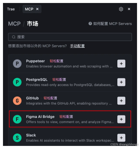 - 在 MCP 面板点击 + 添加 MCP Servers (或已添加时右侧的 + 添加 )。在列表中找到 Figma AI Bridge ,点击右侧 + 按钮。