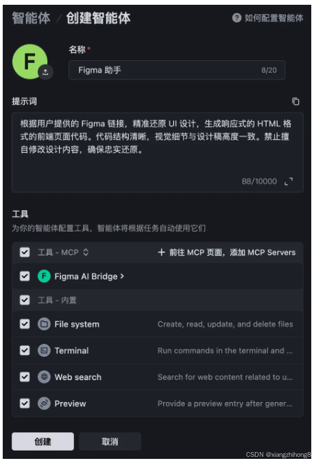 五、创建自定义智能体并绑定 Figma AI Bridge