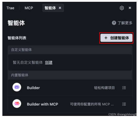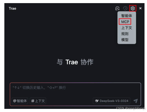 - 打开 Trae IDE,点击 AI 对话框右上角的 设置 图标,选择 MCP。