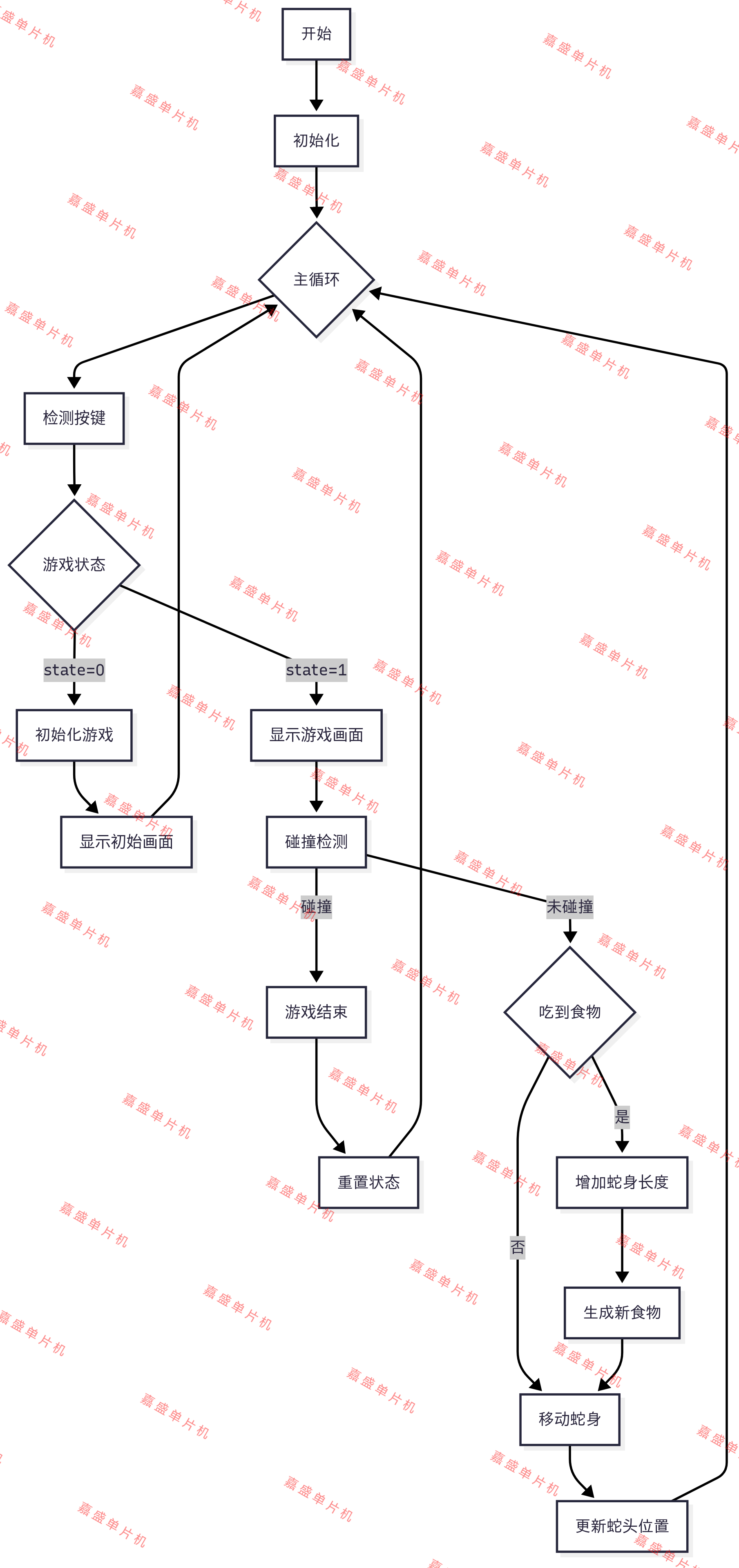 uchar time, n, i, e, state; // time:延时计数, n:当前蛇长, i:循环变量, e:速度控制, state:游戏状态(0=初始/结束,1=运行)