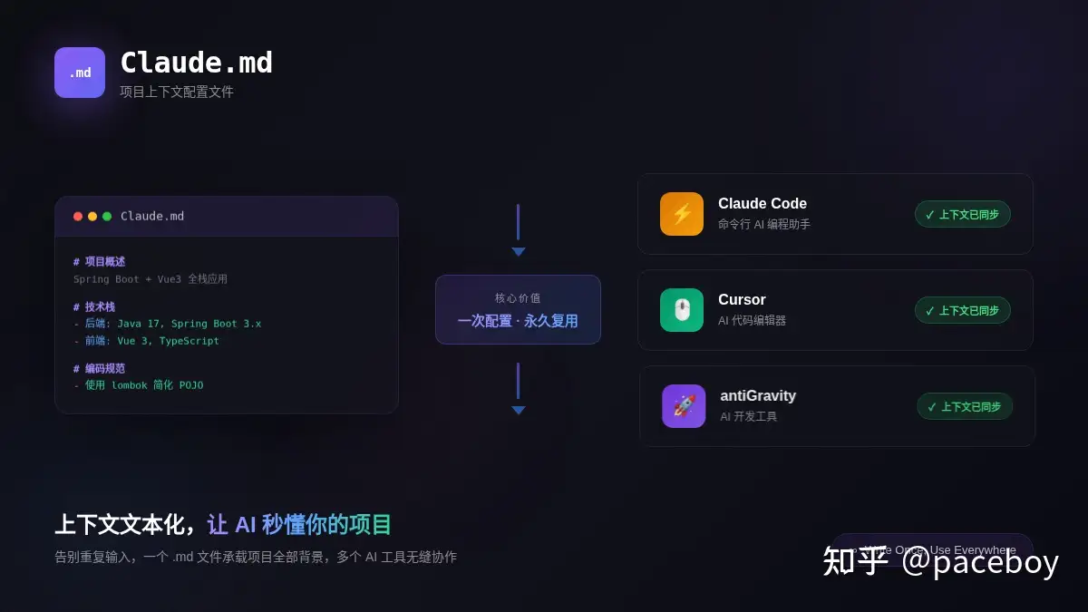 同时Claude.md也可以用来给到Cursor,antiGravity,让它们快速知道上下文,便于跟Claude协同工作。