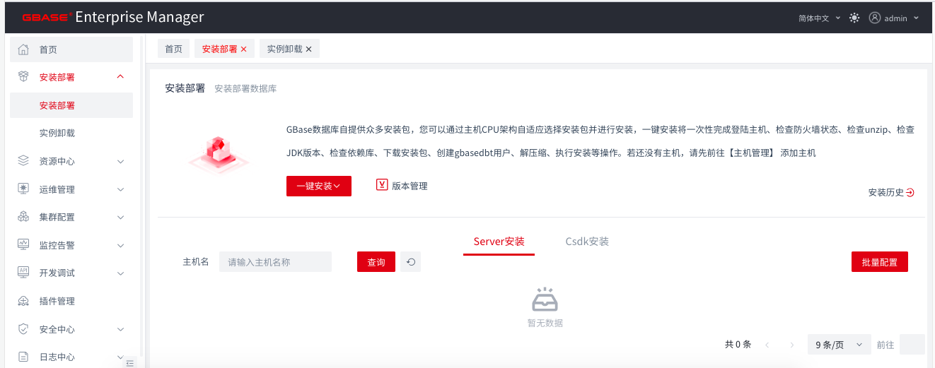 安装部署模块支持数据库server的安装、实例初始化和数据库实例的卸载功能。用户 上传需要安装的安装包建立自己的版本库,要求安装包为.tar。通过选择待安装数据库实 例的主机和安装数据库的版本,可以实现GBase 8s数据库的安装及实例初始化。实例卸 载页面通过选择