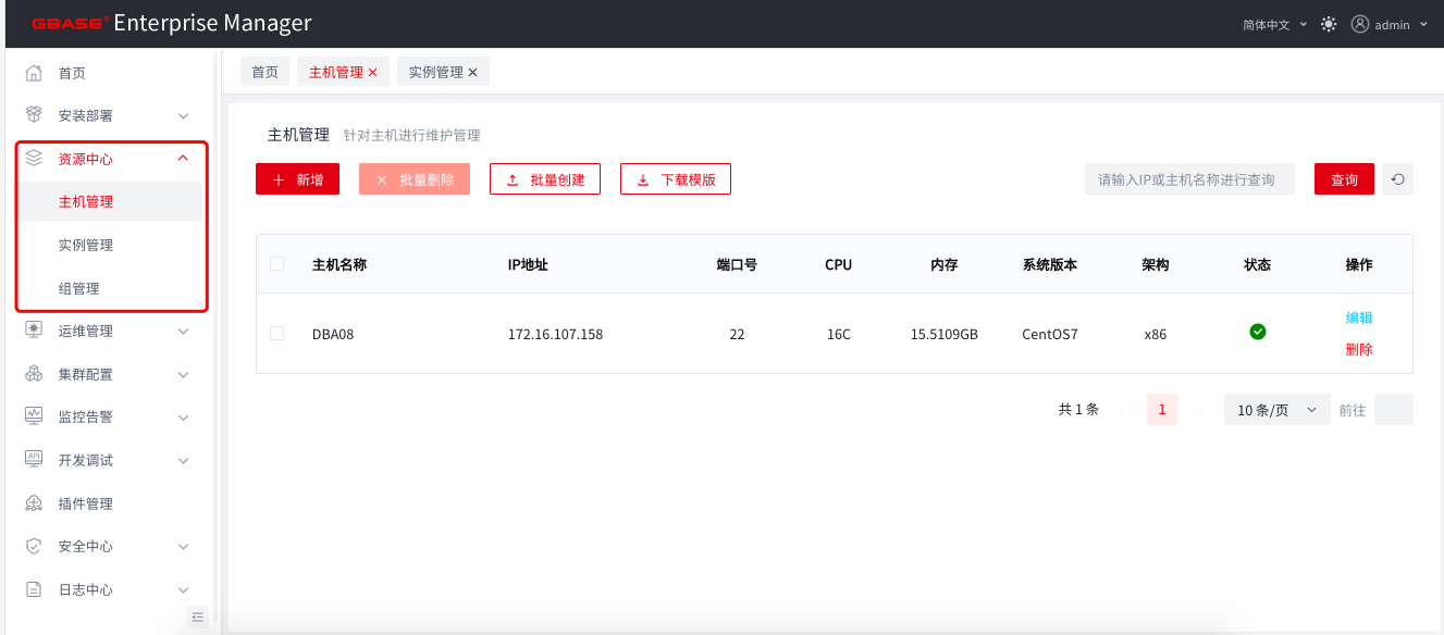 资源中心包括服务器的主机管理、数据库的实例管理和组管理三大模块