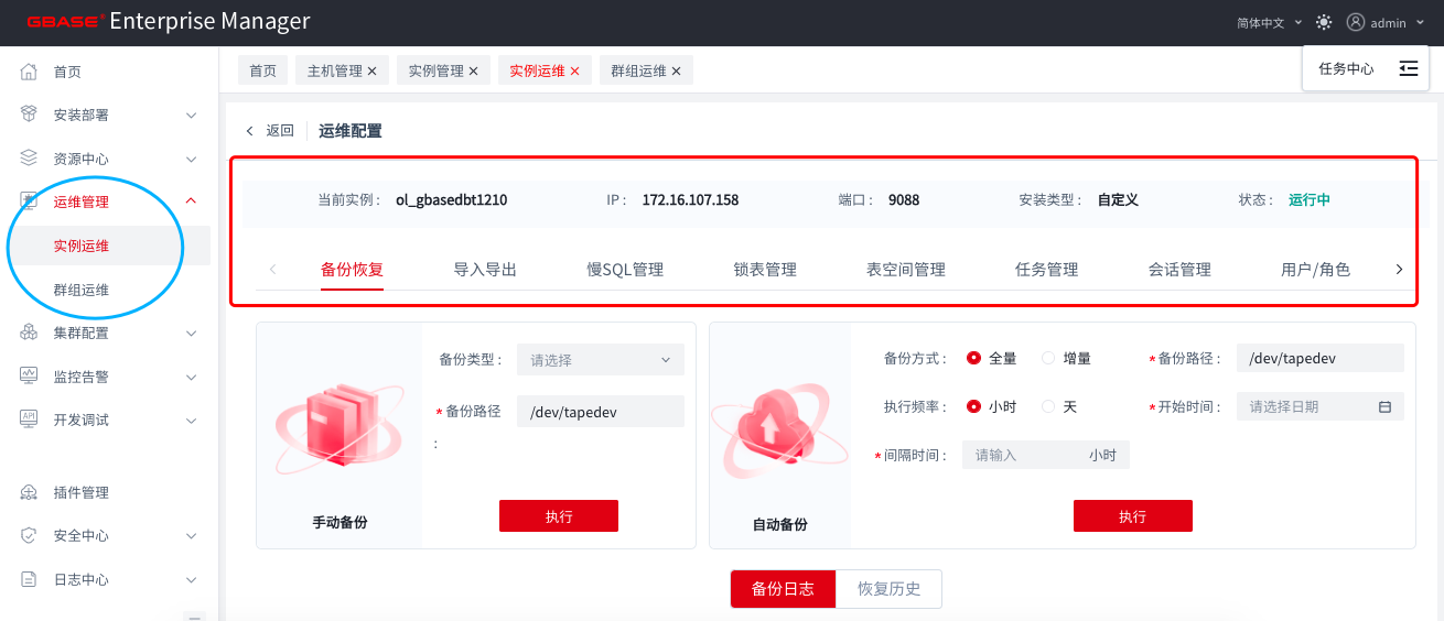 实例运维包括:备份恢复、导入导出、慢SQL 管理、锁表管理、表空间管理、任务管理、会话管理、用户角色管理和参数配置;