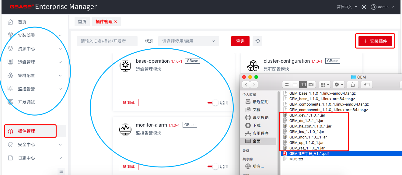 GEM通过插件管理模块实现对插件的安装、卸载、启用和停用功能。安装插件时需 要从客户端本地上传GBASE提供的.jar安装包,点击开始,启动插件的安装。插件成功 安装后会出现在工具首页的插件列表和工具左侧的功能树中。