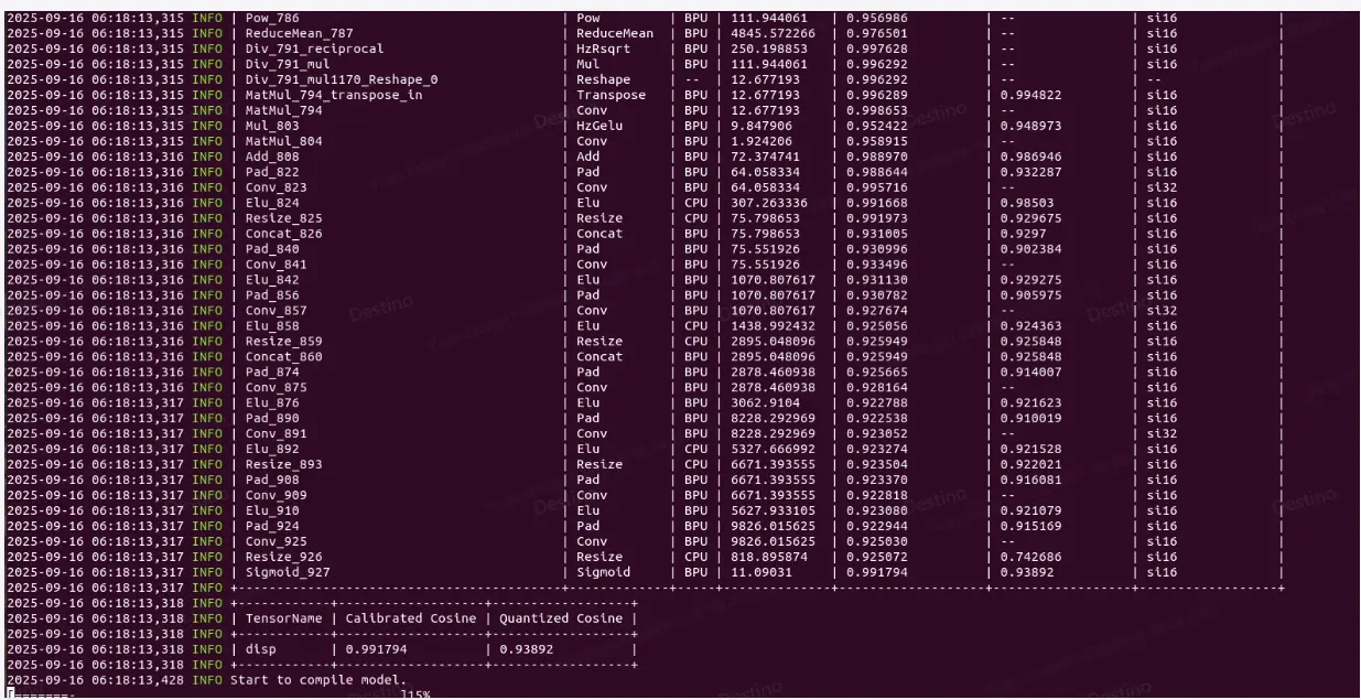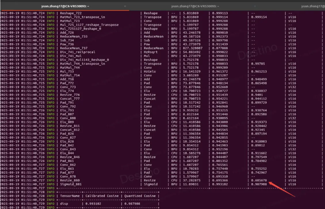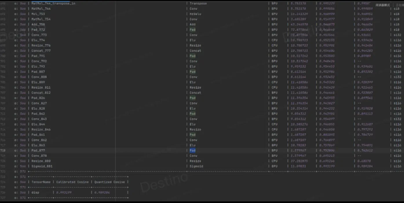 如图 2,基于全 int16 算子配置量化,当前版本 resize 算子有约束(请查阅工具链算子支持情况),只能支持 int8 量化,即使配置了 int16,但算子依旧退化到 int8,因此算子的 cosine 相似度也比较低,基于此阈值,max_qscale=6653/127=52.385,此 scale 过于大,并不能精细化量化模型,所以全 BPU 算子的整体精度都不高。