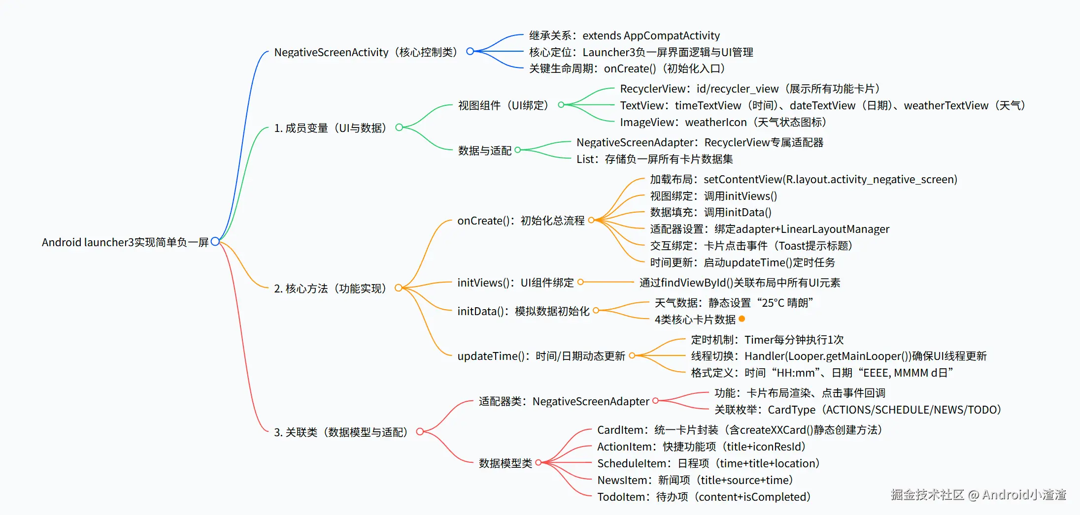 以分层架构 + 模块化设计 为核心,通过 "数据模型封装 - UI 适配渲染 - 界面逻辑控制" 三层结构,快速搭建 Launcher3 负一屏功能,核心是利用RecyclerView嵌套实现 "卡片容器 + 子项列表" 的灵活布局,同时保证界面交互与数据展示的解耦。