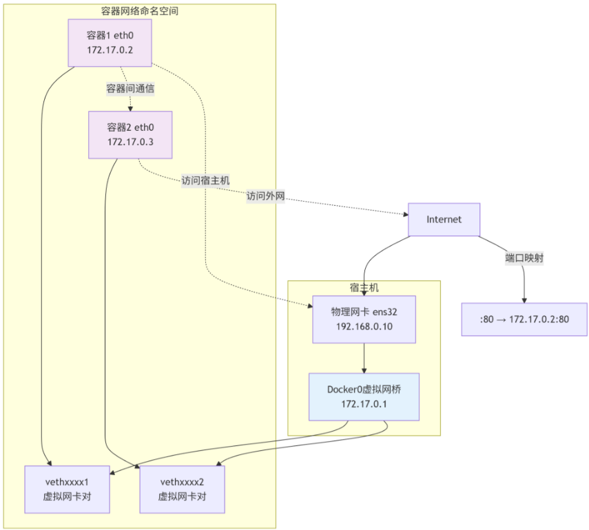 每个容器都有一个对应的veth(虚拟以太网)接口: