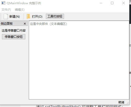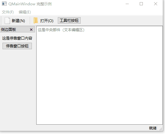 以下示例包含菜单栏、工具栏、状态栏、中央部件、停靠窗口的完整实现: